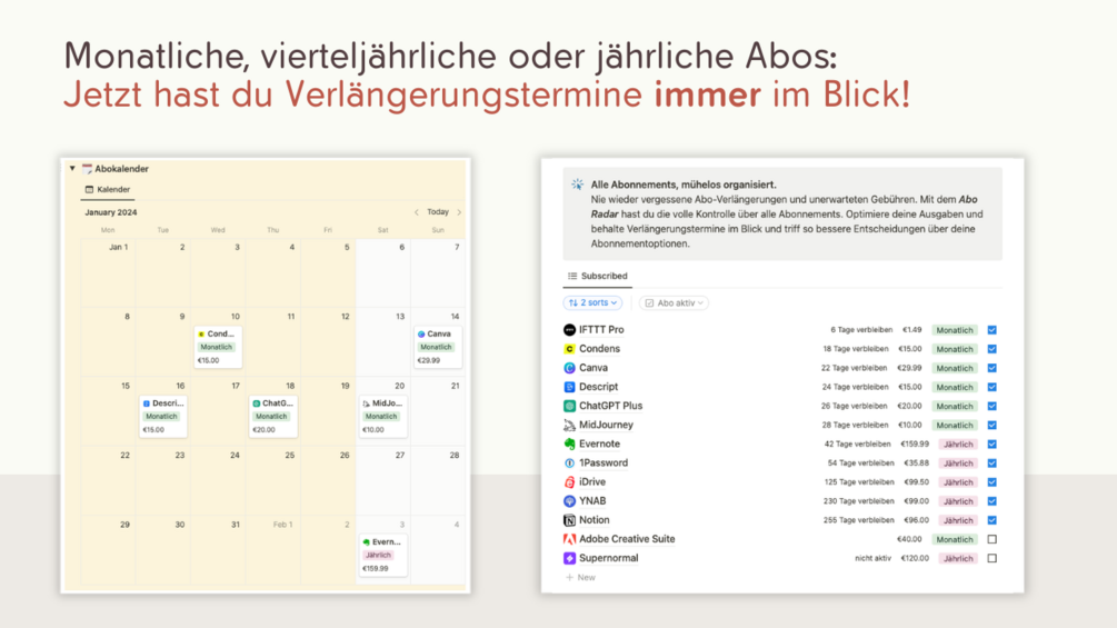 - Automatischer Abokalender: Ein Kalender der bevorstehende Verlängerungen automatisch für dich berechnet mit Optionen für monatliche, vierteljährliche und jährliche Abos.