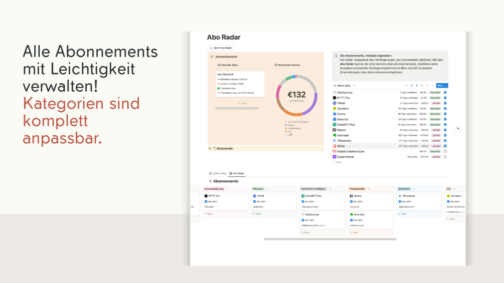 - Anpassbare Kategorien: Organisiere deine Abos so, wie es für dich Sinn macht – von Unterhaltung bis zu Dienstprogrammen.