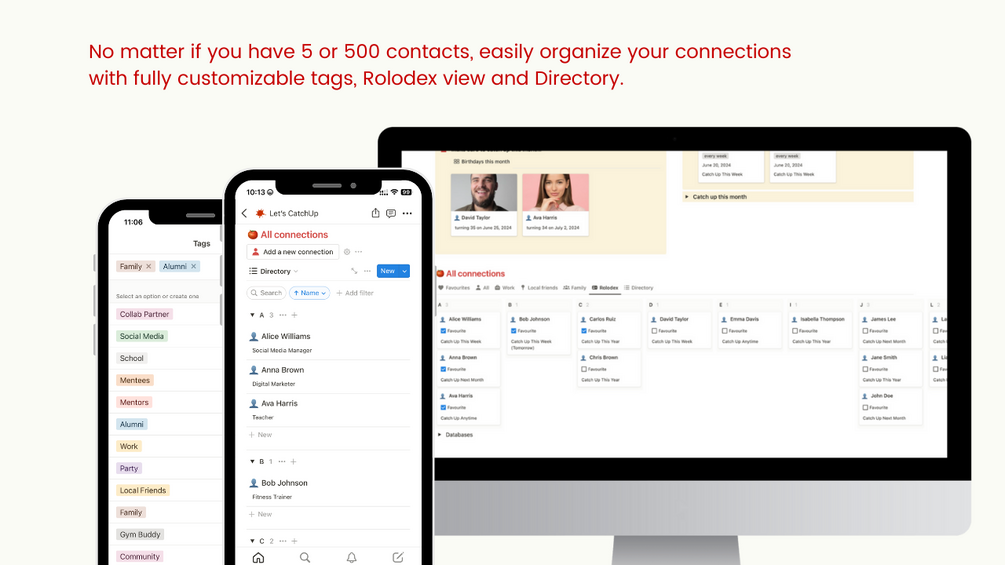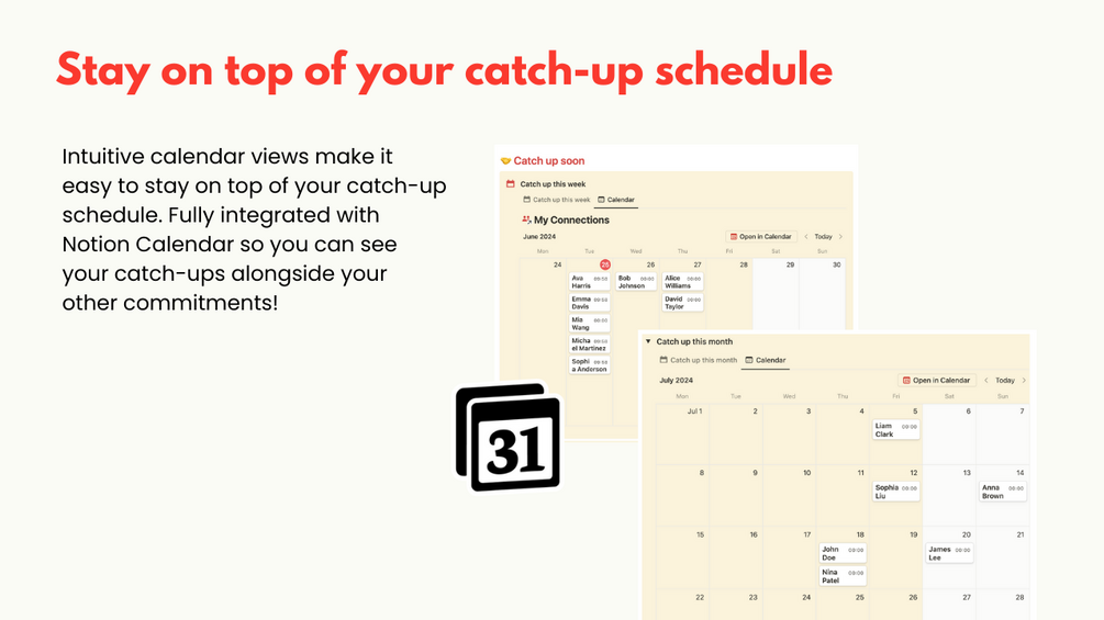 Get timely notifications and visualize your catch-up schedule in automatically calculated weekly or monthly views to never miss an opportunity to connect. And if you're a user of the free Notion Calendar app, your catch-up schedule will show there too alongside all your other commitments!