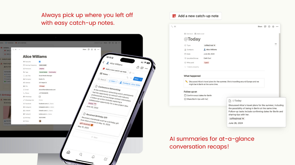 Never enter a conversation unprepared again. With AI summaries for quick recaps and detailed notes of past interactions, you're always ready to pick up right where you left off.