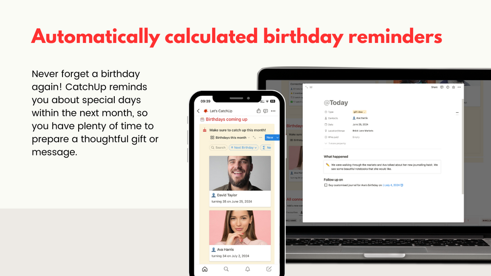 - Forget Forgetting: Missing a birthday or a follow-up can do more than just cost an opportunity—it can weaken your relationships 😱 With CatchUp, those days are over. Managing birthdays and your catch-up schedule is effortless, making it easier than ever to stay connected.