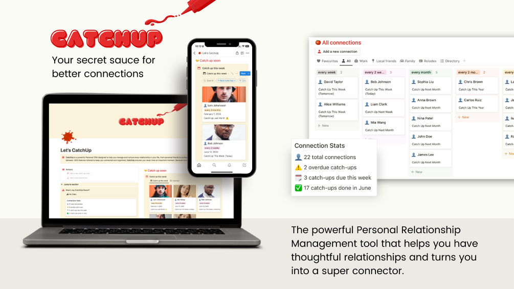 - Start Catching Up the Smart Way: Upgrade your networking with CatchUp. Get this template today and revolutionize how you manage and nurture your relationships. Remember, the quality of your relationships determines the quality of your life ☝️ Make each one count with CatchUp.