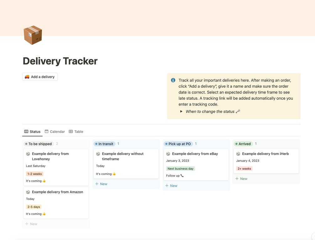 Track all your important deliveries with this powerful and simple Notion template. After making an order, click “Add a delivery”, give it a name and change the order date if required. If you select an expected delivery timeframe the tracker will automatically display whether your delivery is on track or requires following up. A tracking link will be added automatically if you enter a tracking code. Never miss a delivery again!