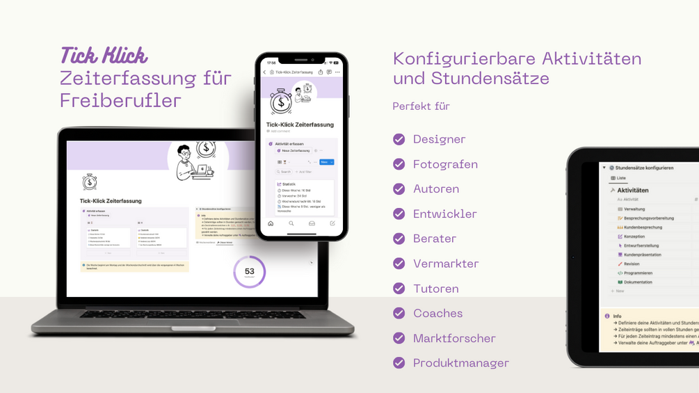 Behalte den Überblick über Dein Freelancer-Business mit "Tick Klick - Zeiterfassung für Freiberufler" in Notion! Dieses sorgfältig entwickelte und professionell gestaltete Tool ist das Ergebnis meiner eigenen Leidenschaft für Organisation und einem starken Gespür für Effizienz. "Tick Klick" ist Dein Schlüssel, um Deine Zeit souverän zu managen und Dein Arbeitserlebnis auf ein neues Level zu heben.