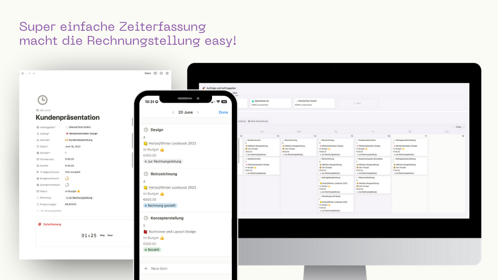 Komplett anpassbare Notion-Vorlage die es Freiberuflern ermöglicht effizient ihre Stunden zu erfassen